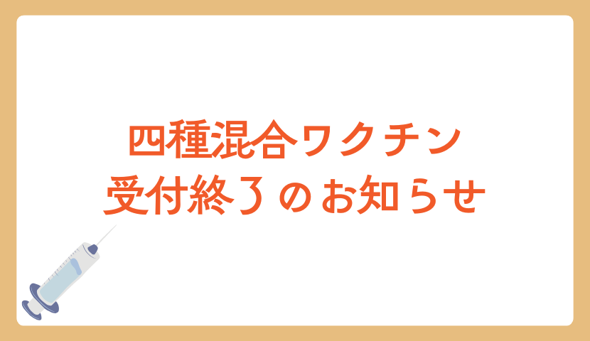 四種混合ワクチンの製造中止に伴い当院での四種混合ワクチンの取り扱いもお電話のみとさせていただいておりましたが、在庫分が終了となりました。